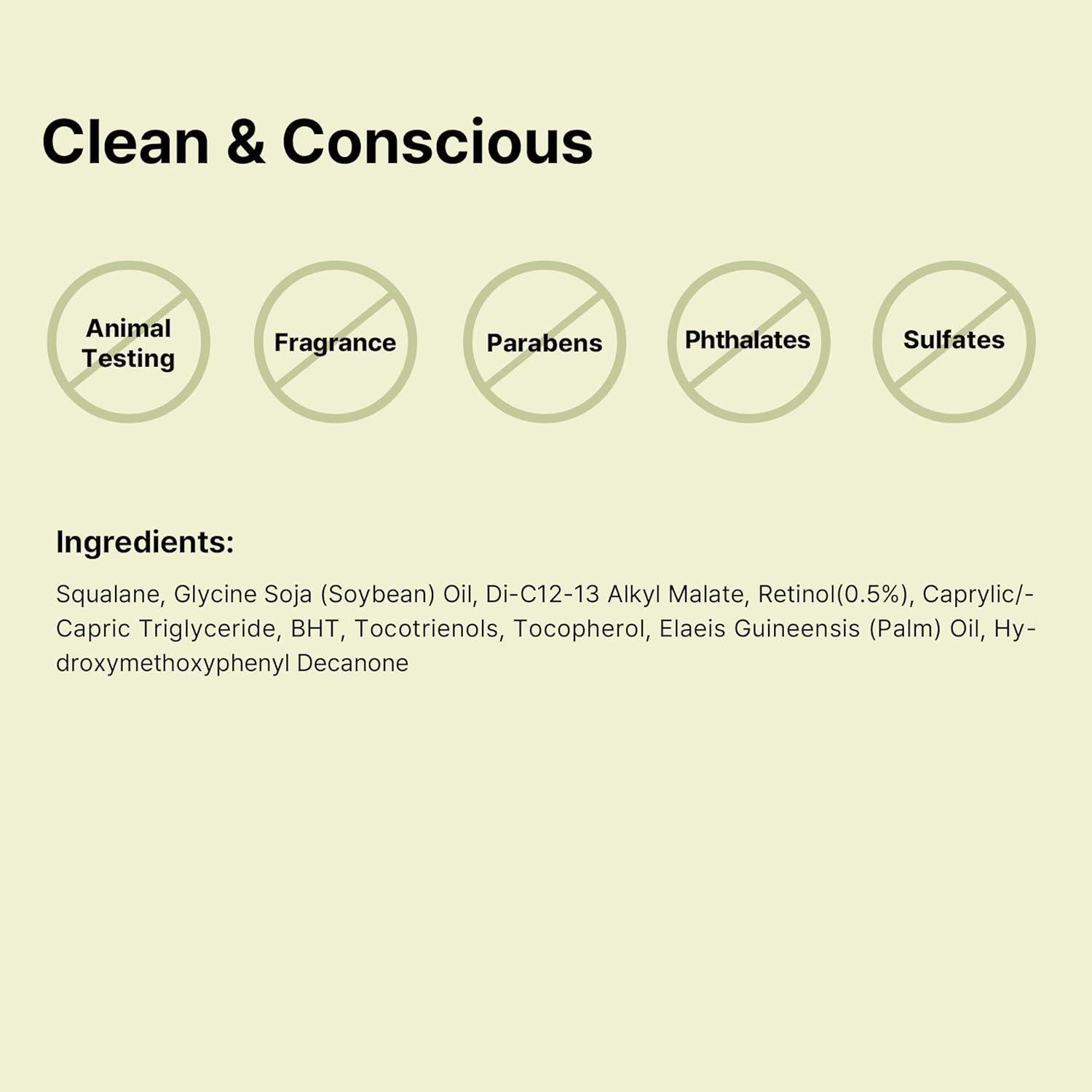 Squalan, Glycin-Soja (Sojabohnenöl), Di-C12-13-Alkylmalat, Retinol (0,5%), Caprylic/Capric-Triglycerid, BHT, Tocotrienole, Tocopherol, Elaeis Guineensis (Palmenöl), Hydroxymethoxyphenyl Decanon